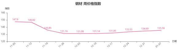 本周,钢材类周价格指数收于135.56点,环比上涨0.87点,涨幅0.65%。从盘面看,钢材三级分类全部出现上涨,其中建筑钢材类涨幅最大,指数环比上涨1.27点,成拉动指数上涨主力,型材类、板材类、管材类指数分别上涨0.80点、0.69点和0.68点。