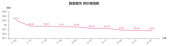 本周,服装服饰类周价格指数收于95.63点,环比下跌0.01点。从盘面看,服饰类中的围巾/披肩下跌0.10点,服装类中的男装下跌0.08点,是拉动服装服饰类周价格指数下跌的主要因素。