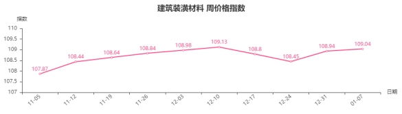 本周,建筑装潢材料类周价格指数收于109.04点,环比上涨0.10点,涨幅0.09%。从盘面看,二级分类中主要是装饰材料类出现上涨,指数环比上涨0.10点,其中工艺装饰材料类、涂料油漆胶粘剂类涨幅较大。