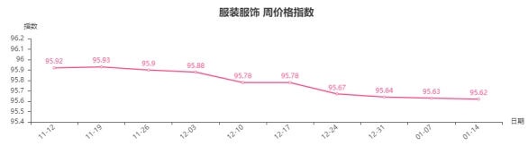 本周,服装服饰类周价格指数收于95.62点,环比下跌0.01点。从盘面看,服装类中的男童、女装、女童装分别下跌0.05、0.02、0.01点,是拉动服装服饰类周价格指数下跌的主要因素。