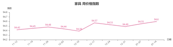 本周,家具类周价格指数收于94.60点,环比上涨0.05点,从盘面看,架、柜类分别上涨0.50、0.11点,是拉动家具类周价格指数上涨的主要因素。