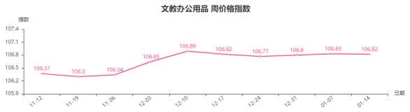本周,文教办公用品类周价格指数收于106.82点,环比下跌0.01点。二级子类中,文化办公用品类指数下跌0.01点,体育娱乐用品类指数较上周持平。