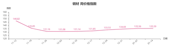本周,钢材类周价格指数收于135.59点,环比上涨0.03点,涨幅0.02%。从盘面看,钢材三级分类中型材类、建筑钢材类出现上涨,分别上涨0.09点和0.04点,管材类、板材类微幅下跌,指数分别下跌0.01点、0.05点。