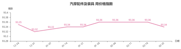 本周,汽摩配件及装具类周价格指数收于93.34点,环比下跌0.02点。从盘面看,二级分类中跌多涨少,汽车装饰类指数下跌0.10点,主要是汽车养护用品、小饰品、玻璃贴膜、座垫价格下降;汽车配件类指数上涨0.01点,主要是底盘系统配件价格小幅走高。