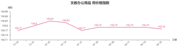 本周,文教办公用品类周价格指数收于106.78点,环比下跌0.01点,跌幅0.01%。从二级分类看,体育娱乐用品周价格指数小幅下跌,收于120.32点,降幅为0.02%;文化办公用品周价格指数微幅上涨,涨幅为0.01%。