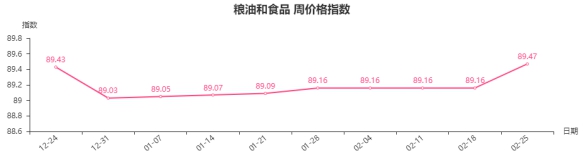 本周,粮油和食品类周价格指数收于89.47点,环比上涨0.31点。从盘面看,粮油、调味品类分别上涨0.32、0.27点,是拉动粮油和食品类周价格指数上涨的主要原因。