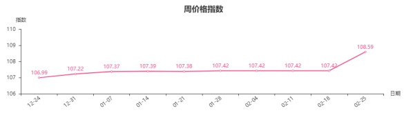 春节过后,随着学生返校,文教办公用品市场需求增加,交易额环比小幅上涨,书写工具、自动化设备等产品销量提高,市场客流量增加。为加快资金周转速度,经销商对部分产品降价促销,致使平均销售价格下降,带动本周价格指数小幅下行。从具体规格品看,科密火星230装订机本周均价为140元/台,价格环比下跌2.00%;魔百盒蓝牙遥控器本周均价为25元/个,价格环比下跌1.50%;奥强1002乒乓球拍本周均价为8.50元/支,价格环比下跌0.90%。