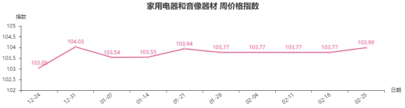 本周,家用电器和音像器材类周价格指数收于103.99点,环比上涨0.22点。从盘面看,二级分类中以上涨为主,热水器、音像器材、厨房电器、净化电器、个人生活电器指数分别上涨2.55、0.37、0.16、0.09、0.08点;制冷电器下跌0.01点。
