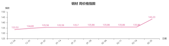 本周,钢材类周价格指数收于143.23点,环比上涨7.37点,涨幅5.42%。从盘面看,钢材三级分类全部出现上涨,其中型材类、建筑钢材类指数涨幅明显,分别上涨9.41点和9.30点,成拉动指数上涨主要因素,板材类、管材类指数分别上涨4.50点和2.87点。