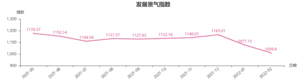从发展景气指数构成来看,2022年2月份,发展规模指数收于868.39点,环比下跌155.46点,跌幅15.18%,调查问卷显示,认为本月本类商品的进货量上升的商户环比下跌8.64%;发展效益指数收于1251.15点,环比上涨34.15点,涨幅2.81%,调查问卷显示,认为本月本类商品进货价格水平下降的商户环比上涨1.5%;发展信心指数收于1000.29点,环比下跌0.36点,跌幅0.04%,调查问卷显示,认为本月本类商品总体经营状况较好的商户环比下跌2.08%。