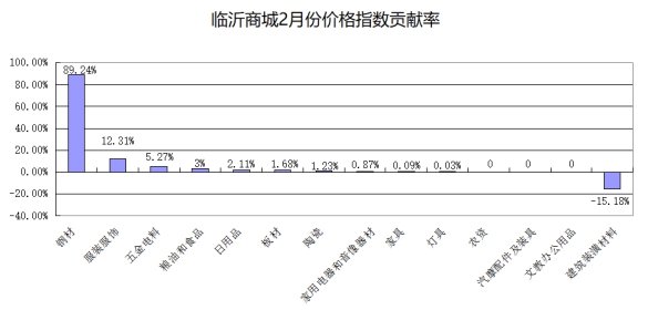 从对价格总指数贡献率看,本月临沂商城价格指数主要受钢材类、服装服饰类拉动上涨,贡献率分别为89.24%、12.31%(见下图)。