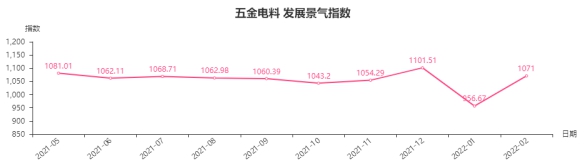 2月份,五金电料类发展景气指数收于1071.00点,环比上涨114.33点,涨幅11.95%;同比上涨61.90点,涨幅6.13%。