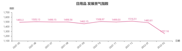 2月份,日用品类发展景气指数收于1257.16点,同比下跌8.78点,跌幅0.69%;环比下跌226.45点,跌幅15.26%。