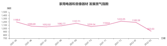2月份,家用电器和音像器材类发展景气指数收于922.03点,环比下跌263.56点,跌幅22.23%,同比下跌98.71点,跌幅9.67%。