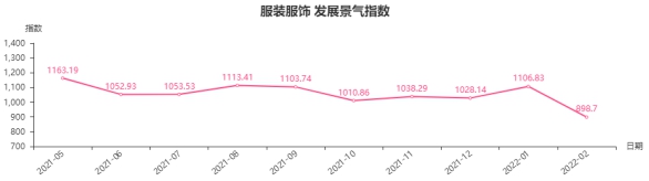 2月份,服装服饰类发展景气指数收于898.70点,环比下跌208.13点,跌幅18.80%。