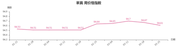 本周,家具类周价格指数收于94.61点,环比下跌0.06点,从盘面看,架、坐具类分别下跌0.51点和0.03点,是拉动家具类周价格指数下跌的主要因素。