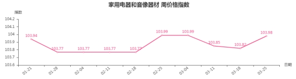 本周,家用电器和音像器材类周价格指数收于103.98点,环比上涨0.16点。从盘面看,净化电器、制冷电器、厨房电器、个人生活电器、音像器材指数回升,分别上涨0.85、0.58、0.23、0.17、0.03点;热水器、取暖电器指数下跌,分别下跌0.49、0.03点。