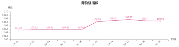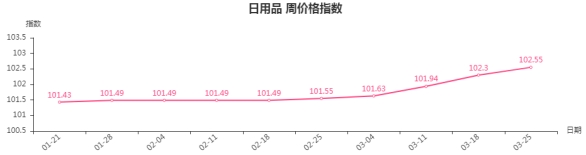 随着季节转换气温回升,人们户外活动增加,家、工装等行业施工速度加快,衣、发饰品、护理用品、日用工艺品等产品销量提高,市场交易量增加,带动日用品产品平均销售价格小幅上涨,致使本周日用品类周价格指数上涨。从具体规格品看,顶雅胸针本周均价为12.72元/个,价格环比上涨2.50%;摩登女孩弹力发绳本周均价为5.41元/个,价格环比上涨3.00%;名蔻卸妆液本周均价为5.41元/盒,价格环比上涨2.70%;新娘树脂台灯本周均价为38.33元/个,价格环比上涨3.20%;金鱼戏珠流水鱼缸(中号)本周均价为500.00元/个,价格环比上涨4.20%。