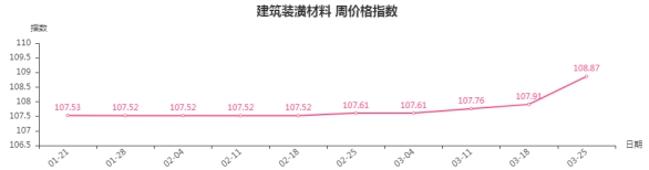 本周,建筑装潢材料类周价格指数收于108.87点,环比上涨0.96点,涨幅0.89%。从盘面看,二级分类中涨多跌少,其中装饰材料类上涨幅度最大,上涨1.03点,成拉动指数上涨主力,专用材料类指数微涨0.04点,结构安装材料类环比下跌0.05点。