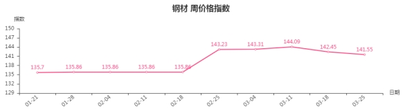 本周,钢材类周价格指数收于141.55点,环比下跌0.90点,跌幅0.63%。从盘面看,钢材三级分类全部出现下行,其中板材类跌幅最大,指数环比下跌1.30点,管材类、建筑钢材类、型材类指数则分别下跌0.43点、0.63点和0.99点。