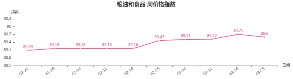 本周,粮油和食品类周价格指数收于89.60点,环比下跌0.11点。从盘面看,粮油、干果、蔬菜制品类分别下跌1.00、0.03、0.02点,是拉动粮油和食品类周价格指数下跌的主要原因。