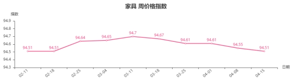 本周,家具类周价格指数收于94.51点,环比下跌0.04点。从盘面看,床及用品、柜类分别下跌0.11点和0.07点,是导致家具类周价格指数下跌的主要因素。