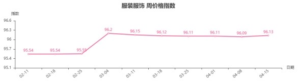 本周,服装服饰类周价格指数收于96.13点,环比上涨0.04点。从盘面看,腰带、女装、男装类分别上涨0.46、0.08、0.05点,是拉动服装服饰类周价格指数上涨的主要因素。