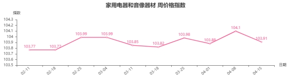 本周,家用电器和音像器材类周价格指数收于103.91点,环比下跌0.19点。从盘面看,制冷电器、净化电器、厨房电器、热水器指数分别下跌0.58、0.55、0.47、0.08点;个人生活电器、家居电器指数分别上涨0.25、0.01点。