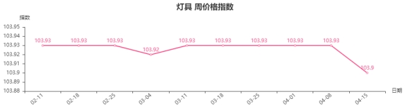 本周,灯具类周价格指数收于103.9点,环比下跌0.03点。从二级分类看,商业照明类、灯具配件类价格指数分别下跌0.13、0.01点。