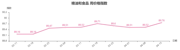 本周,粮油和食品类周价格指数收于89.76点,环比上涨0.24点,涨幅0.27%。从盘面看,二级分类涨多跌少,其中饼干类涨幅最大,指数环比上涨0.57点,成拉动指数上涨主力,粮油、食糖、茶叶、调味品指数同步上涨,分别上涨0.29点、0.22点、0.07点和0.04点,蔬菜制品和干果类则微跌0.03点和0.07点。