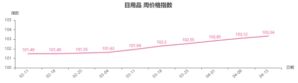 本周,日用品类周价格指数收于103.34点,环比上涨0.22点,涨幅0.21%。从二级分类看,护理及美容用品、首饰、工艺品、厨房用品、卫生清洁用品周价格指数均出现小幅上涨,分别上涨0.99%、0.92%、0.43%、0.26%、0.05%;箱包、玩具周价格小幅下跌,分别下跌0.28%、0.02%。