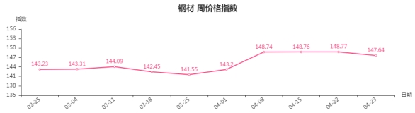本周,钢材类周价格指数收于147.64点,环比下跌1.13点,跌幅0.76%。从盘面看,钢材三级分类全部出现下跌,板材类、建筑钢材类、型材类、管材类指数分别下跌1.37点、1.14点、1.09点和0.75点。