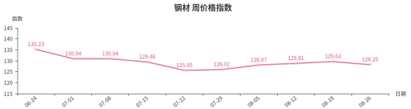 本周,钢材类周价格指数收于128.25点,环比下跌1.38点,跌幅1.06%。从盘面看,钢材三级分类全部出现下跌,其中板材类、建筑钢材类、型材类、管材类指数分别下跌1.55点、1.48点、1.31点和1.08点。