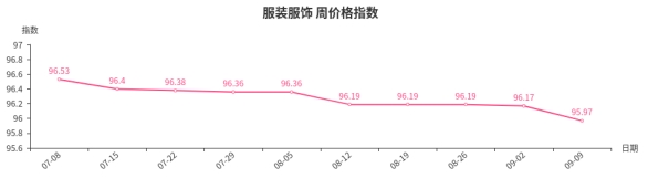 本周,服装服饰类周价格指数收于95.97点,环比下跌0.20点。从盘面看,男装、女装、女童装类分别下跌0.55、0.28、0.08点,是导致服装服饰类周价格指数下跌的主要因素。