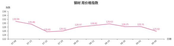 本周,钢材类周价格指数收于125.92点,环比下跌2.39点,跌幅1.86%。从盘面看,钢材三级分类中全部出现下跌,其中型材类、建筑钢材类指数跌幅较大,分别下跌2.44点和3.41点,板材类、管材类指数分别下跌1.81点和1.32点。