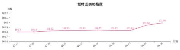 本周,板材类周价格指数收于101.99点,环比上涨0.05点,涨幅0.05%。从指数构成要素看,铝塑板周价格指数上涨0.73点,涨幅0.66%,成为拉动本周板材类周价格指数上行的主要因素;密度板、石膏板、贴面板周价格指数小幅下跌,分别下跌0.01%、0.03%、0.06%。