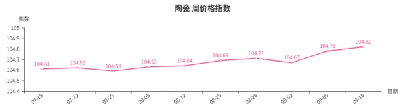 随着天气逐渐凉爽和中秋假期到来,人们外出活动增加,餐饮、家、工装等行业转旺,市场需求释放,陶瓷盘、陶瓷面盆等产品销量见涨,且市场销售主要以散户零售为主,带动陶瓷产品平均销售价格小幅上涨,致使本周陶瓷类周价格指数小幅上涨。从具体规格品看,杭州雅丹2311柜式面盆本周均价为1466.67元/套,价格环比上涨3.30%;瓷运阁18*18陶瓷盘本周均价为16.95元/个,价格环比上涨1.90%;初夏5寸陶瓷碗本周均价为16.79元/个,价格环比上涨1.10%。