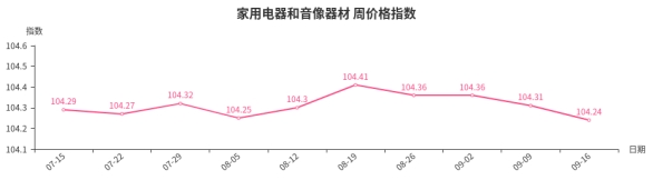 本周,家用电器和音像器材类周价格指数收于104.24点,环比下跌0.07点。从盘面看,制冷电器、净化电器、家居电器、音像器材类分别下跌0.59、0.19、0.11、0.07点;热水器、厨房电器类均小幅上涨0.05点。