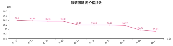 本周,服装服饰类周价格指数收于95.91点,环比下跌0.06点。从盘面看,女装、女童装类分别下跌0.13、0.08点,是导致服装服饰类周价格指数下跌的主要因素。