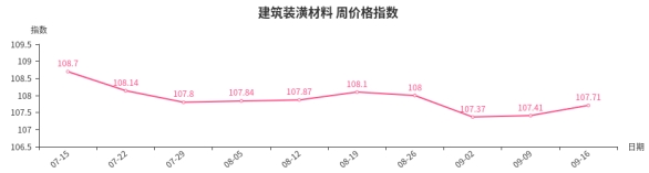 本周,建筑装潢材料类周价格指数收于107.71点,环比上涨0.30点,涨幅0.28%。从盘面看,二级分类中多数出现上涨,其中装饰材料类指数上涨幅度最大,环比上涨0.31点,成拉动指数上涨主力,专用材料类指数上涨0.05点,其他两类指数持平。