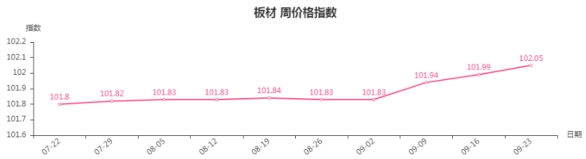 受成品油、铝材等原材料价格持续上涨影响,铝塑板等产品生产、运输成本增加,销售价格随市上调,致使本周板材类产品平均销售价格小幅上涨。从具体规格品看,上海吉祥厚度4mm长1.22m宽2.44m铝厚10s双面铝塑板本周均价为173.00元/张,价格环比上涨4.80%;山东临沂厚度3mm长1.22m宽2.44m铝厚4S双面铝塑板本周均价为83.60元/张,价格环比上涨4.50%;新博牌0.018*1.20*2.44密度板本周均价为64.00元/张,价格环比上涨0.40%。