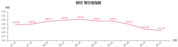 本周,钢材类周价格指数收于121.34点,环比下跌1.02点,跌幅0.83%。从盘面看,钢材三级分类中全部出现下跌,其中板材类跌幅最大,指数环比下跌2.35点,拉动整体指数下跌,型材类、管材类、建筑钢材类指数分别下跌0.89点、0.77点和0.05点。