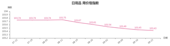 本周,日用品类周价格指数收于103.43点,环比下跌0.02点,跌幅0.02%。从二级分类看,护理及美容用品、首饰、工艺品、箱包、钟表眼镜周价格指数均出现小幅下跌,分别下跌0.47%、0.29%、0.19%、0.05%、0.02%;卫生清洁日用品、厨房用品、针纺织品周价格小幅上涨,分别上涨0.17%、0.10%、0.01%。