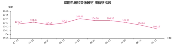 本周,家用电器和音像器材类周价格指数收于104.15点,环比下跌0.09点。从盘面看,制冷电器、厨房电器、净化电器类分别下跌0.44、0.16、0.16点;热水器、音像器材类分别小幅上涨0.03、0.02点。