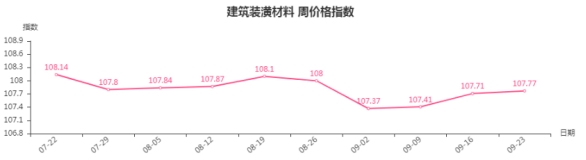本周建筑装潢材料类指数继续微幅上涨,临近9月底,家装市场行情回暖,需求增加,木地板、成品门、扣板等销售量较上周增加,市场批发、零售增多,价格略有上行。从市场具体规格品看,上海RY花卉长40cm宽50cm家居装饰画价格80元/幅,上涨3.2%;上海柔美欧式大花56-183无纺布壁纸价格100元/卷,上涨11%;潍坊市寿光市海港聚合物水泥基防水涂料价格7.2元/kg,上涨2.95%;誉源3#复合胎-5度SBS防水卷材价格19.1元/,上涨0.5%。