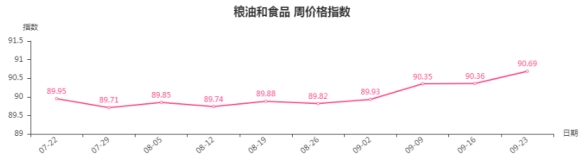 本周,粮油和食品类周价格指数收于90.69点,环比上涨0.33点。二级分类中的粮油类和调味品类分别上涨0.43点和0.11点,是拉动粮油和食品类周价格指数上涨的主要原因。