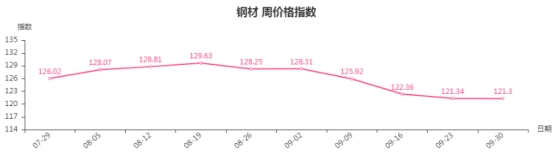 本周,钢材类周价格指数收于121.30点,环比下跌0.04点,跌幅0.03%。从盘面看,钢材三级分类中全部出现下跌,其中板材类跌幅最大,指数环比下跌0.11点,管材类、型材类、建筑钢材类指数分别下跌0.05点、0.01点和0.01点。