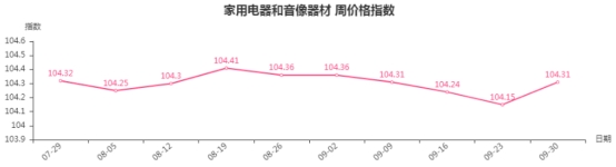 本周,家用电器和音像器材类周价格指数收于104.31点,环比上涨0.16点。从盘面看,厨房电器、热水器、制冷电器类分别小幅上涨0.58、0.03、0.03点;净化电器、音像器材类分别下跌0.17、0.03点。