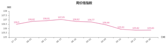 气温适宜,人们出行欲望增加,日用品类产品市场需求增加,行李箱、护肤美容、发饰品等产品销量增加。另外,随着十一假期临近,中下游经销商积极备货,当前市场销售主要以批发为主,带动平均价格下降,致使本周日用品类周价格指数小幅下行。从具体规格品看,英皇PC827-28拉杆箱本周均价为575.52元/个,价格环比下降5.00%;瑞牌S6311书包本周均价为79.28元/个,价格环比下降4.80%;自然一派弹簧夹发夹本周均价为8.05元/个,价格环比下降2.80%。
