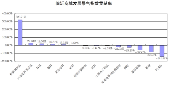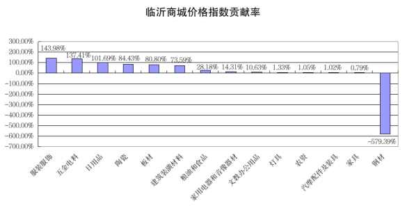 从对价格总指数贡献率看,今年临沂商城价格指数主要由服装服饰类、五金电料类、日用品类等三大类拉动上涨,贡献率分别为143.98%、137.41%、101.69%(见下图)。